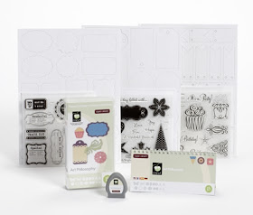 Here's a look at what's included in the Cricut Art Philosophy Collection. You get the Cricut Cartridge which contains 700 images of shapes, 3-D items and a font, 3 D-Size Stamp Sets, and 3-9x12 sheets of Dimensional Elements Chipboard Shapes. The possibilities of what you can create with this collection are endless! Check out these great items below!
